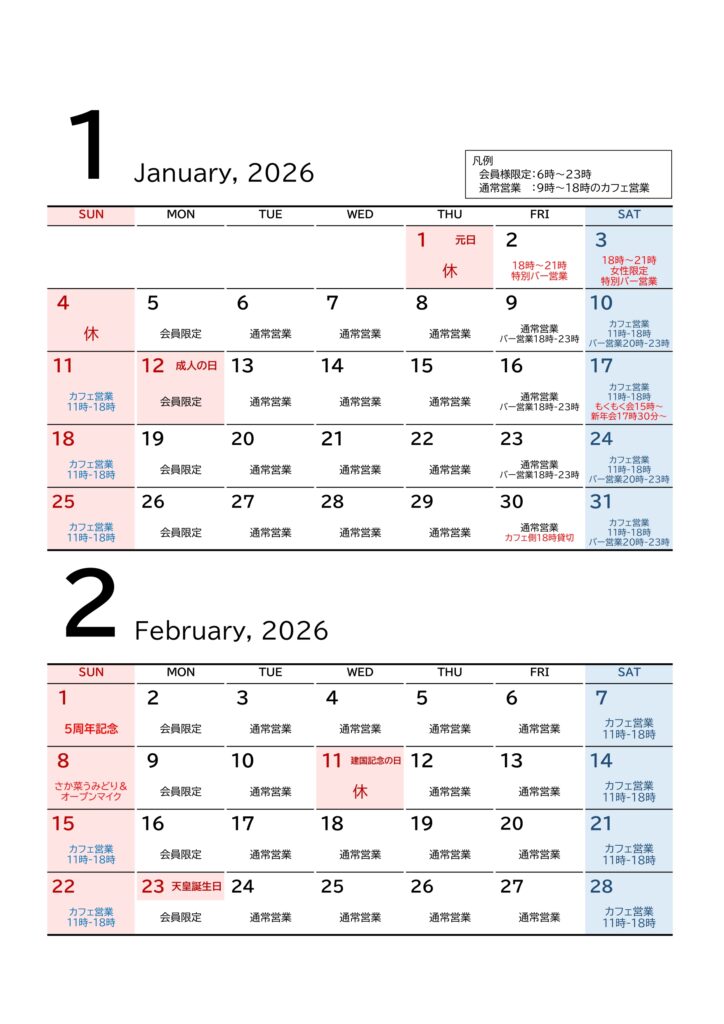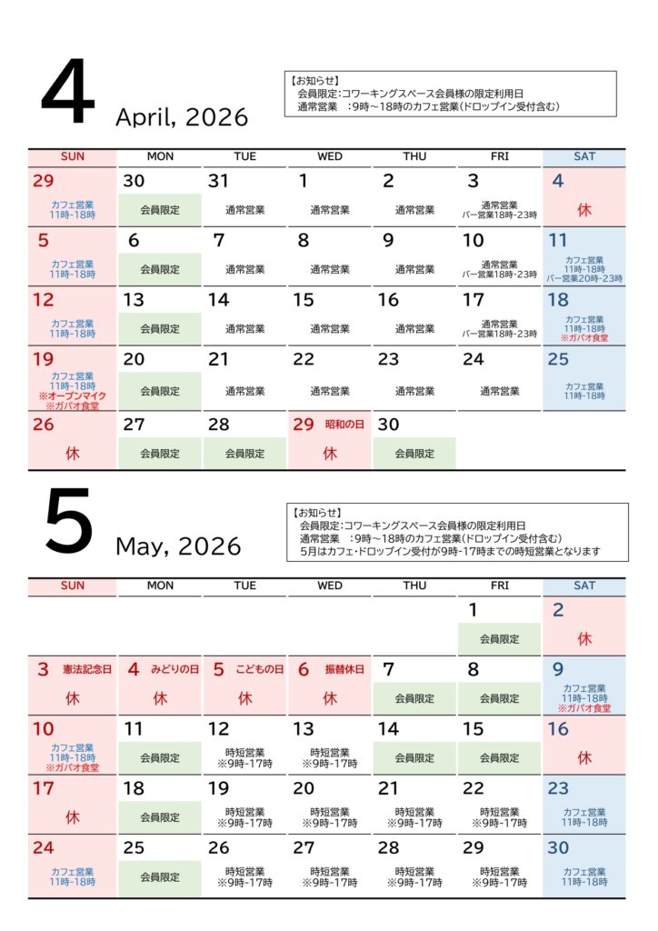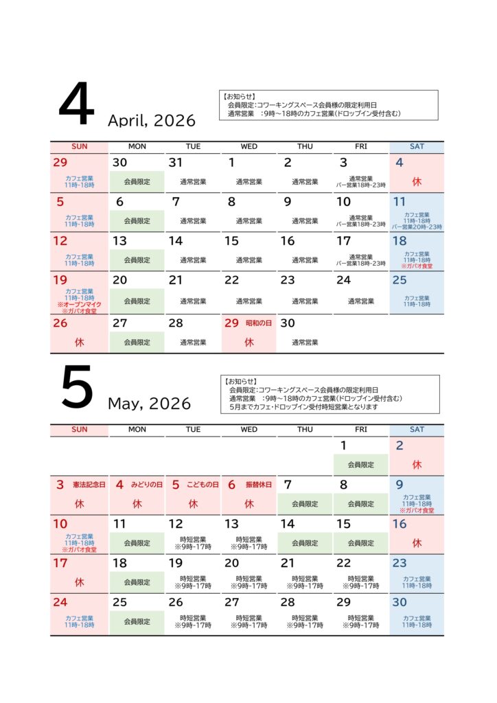 月額会員になると平日6時~23時の間でご利用頂けます。ドロップイン(一時利用)やカフェ利用のみでもご利用頂けますので、気軽にお越しください。土日は11時~18時までカフェ・バー営業中。コーヒー1杯からコワーキングスペースが終日利用できます。※営業時間については下段のカレンダーをご確認ください。