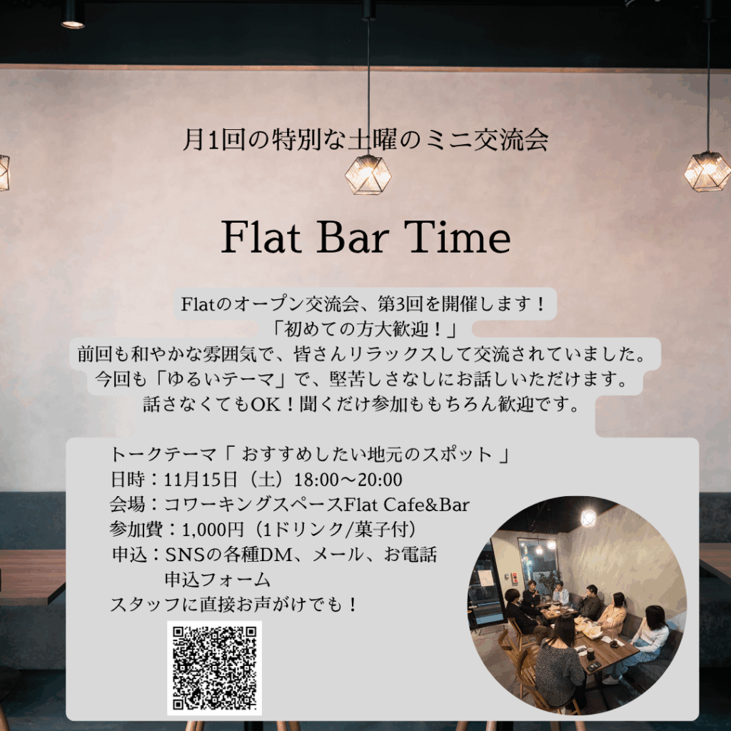 2025.10.29 ミニ交流会【Flat Bar Time】11月15日(土)18時~ 月1回の土曜夜の気楽なミニ交流会 10人未満の気軽な交流会です♪ どなたでも参加OKです お申込みフォーム⇒https://forms.gle/jD8DBeQinQiCbjZW9 Tweet Share 【オープンマイク】11月22日(土...