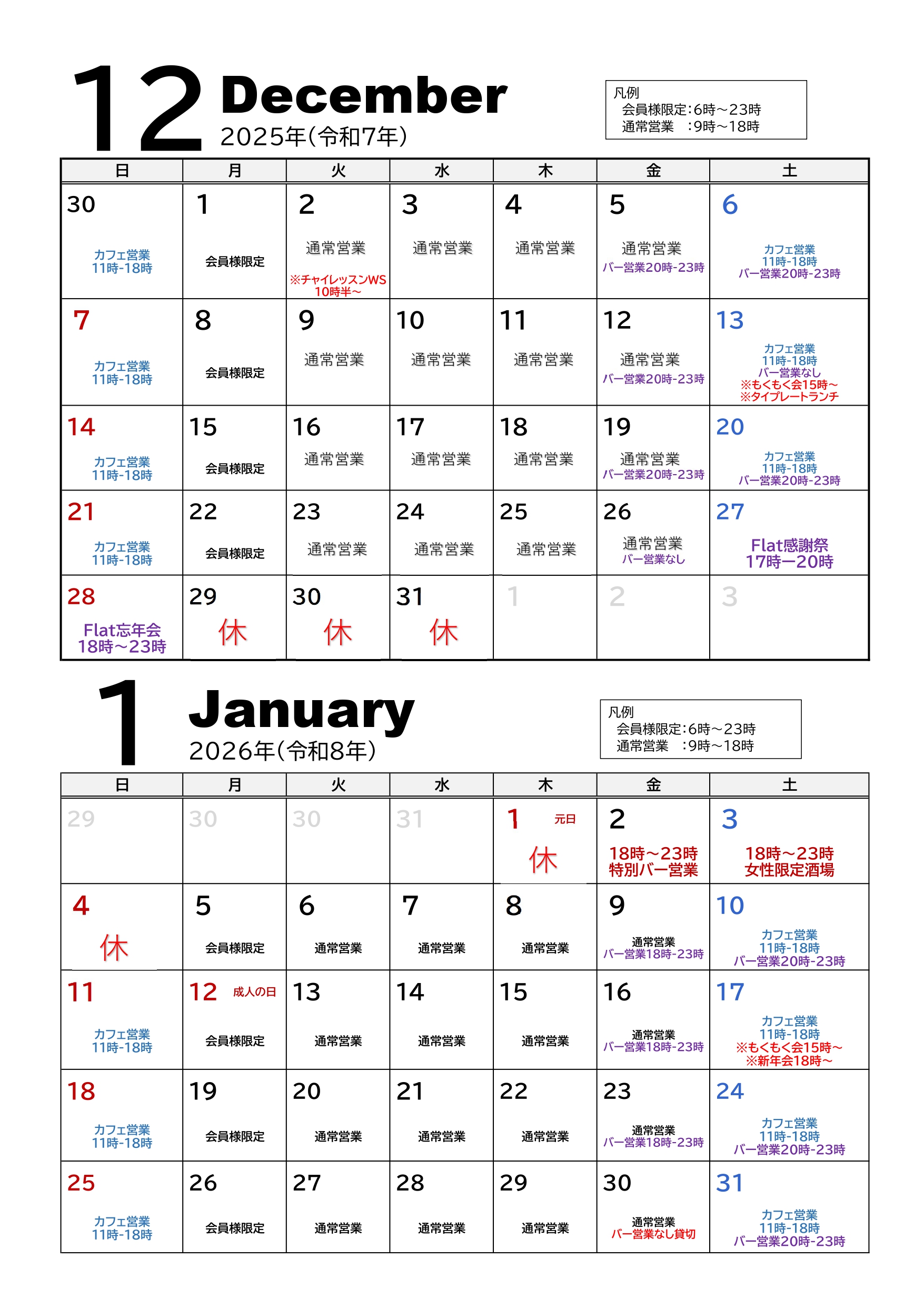 28日(日): Flat忘年会(18:00〜23:00)年内最終日!ご利用者様中心に乾杯しましょう。