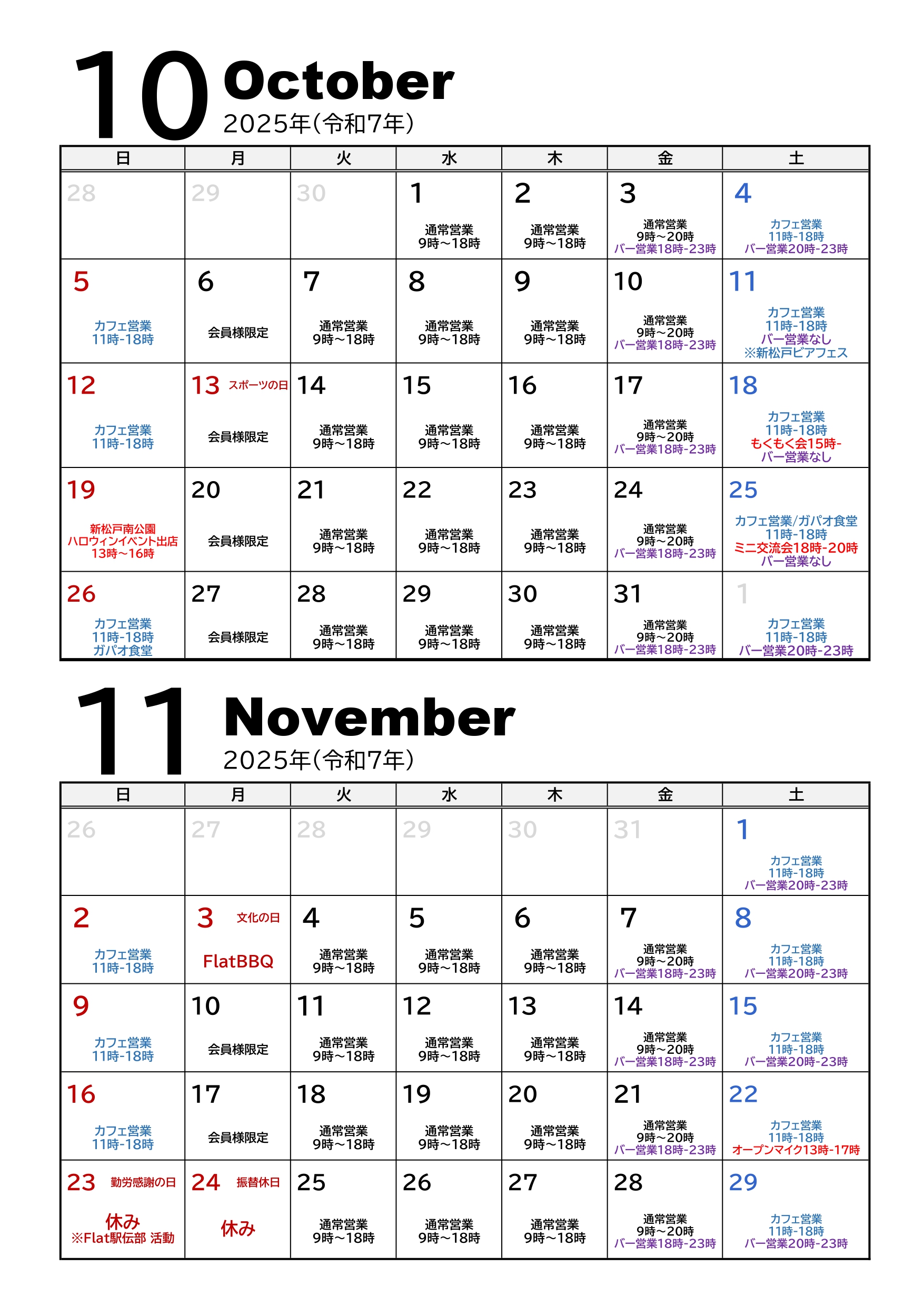 2025年10月〜11月の営業案内